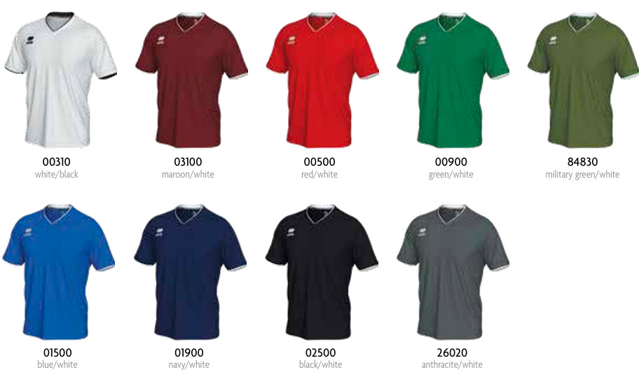 Dez t-shirts de manga curta com gola em V em várias cores com detalhes em branco e códigos associados.