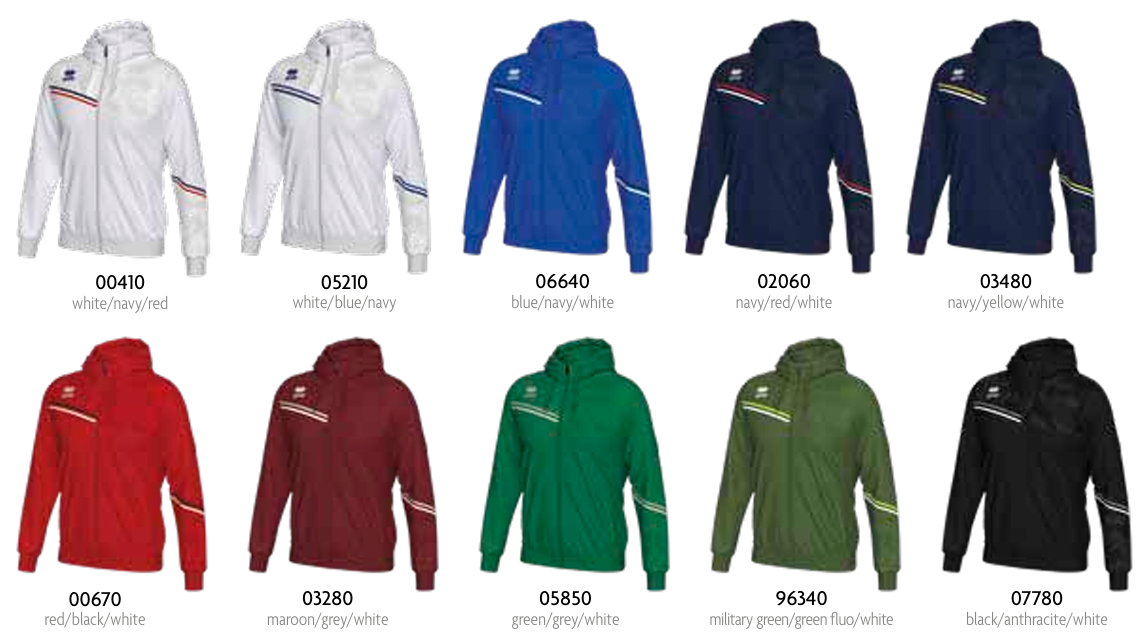 Doze casacos desportivos de várias cores alinhados em duas filas com códigos numéricos