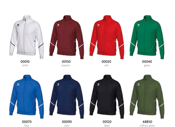 Oito blusões esportivos de zíper em várias cores, com logotipo branco e faixas nas mangas.