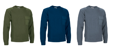 Três camisolas de manga comprida com bolso no peito em verde-oliva, azul escuro e cinzento