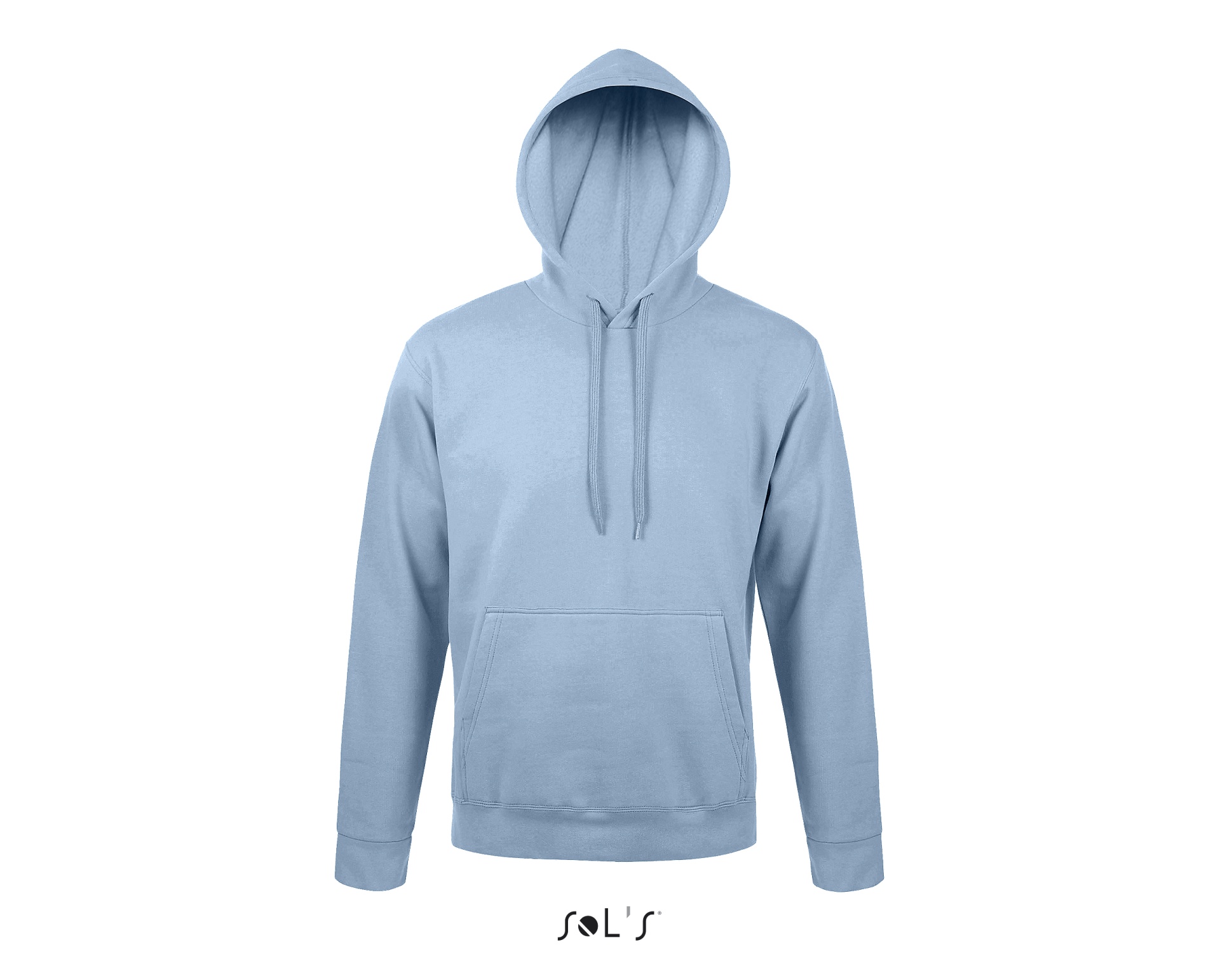 Sweatshirt com capuz azul claro, bolso canguru e cordões no capuz