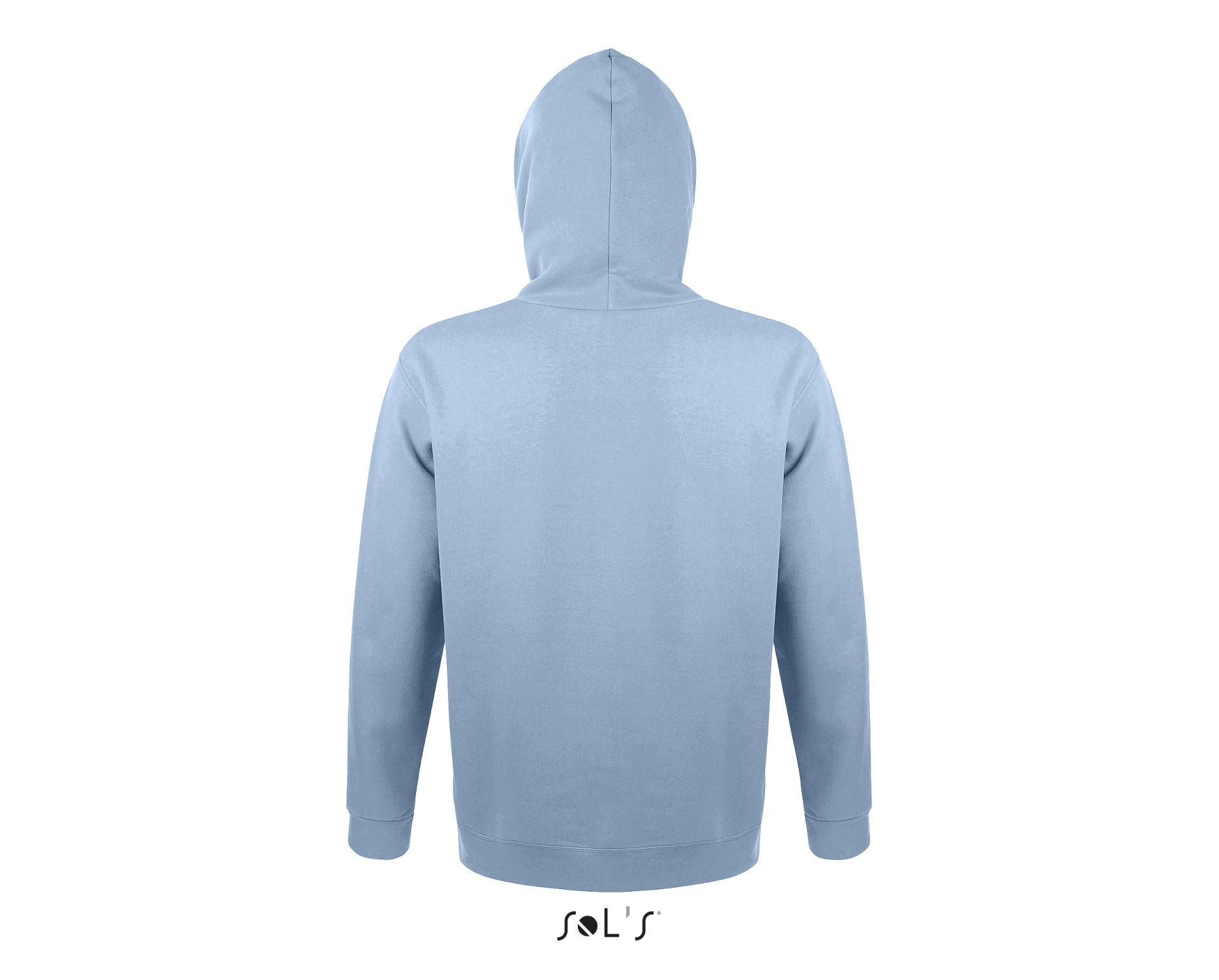 Camisola azul clara com capuz vista de costas sobre fundo branco