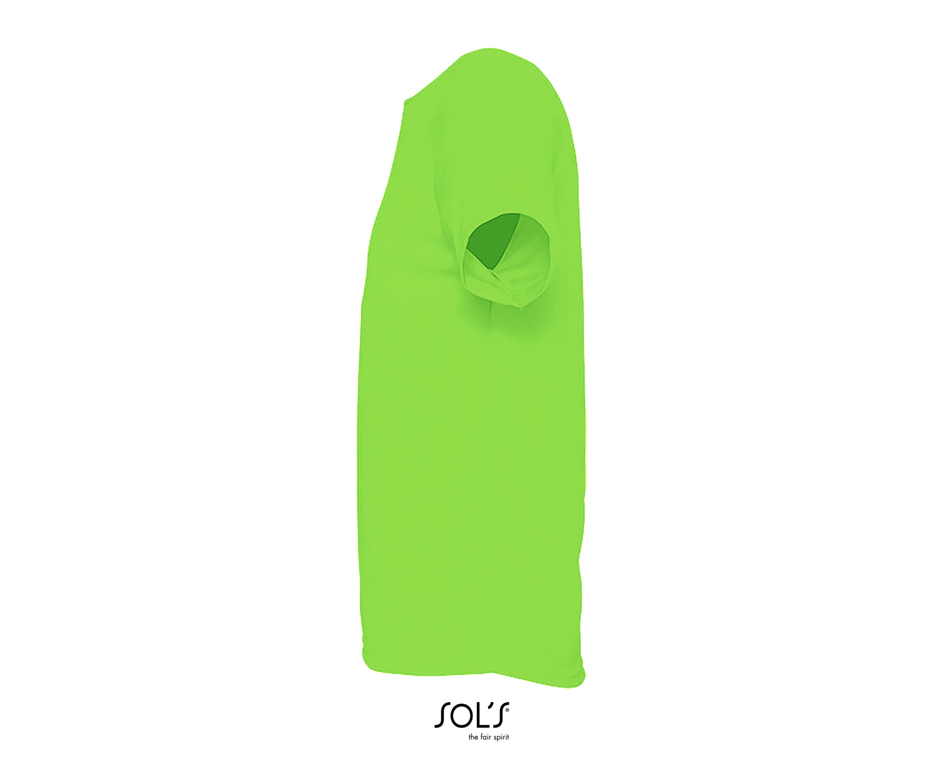 T-shirt verde fluorescente unissexo, vista lateral, gola redonda